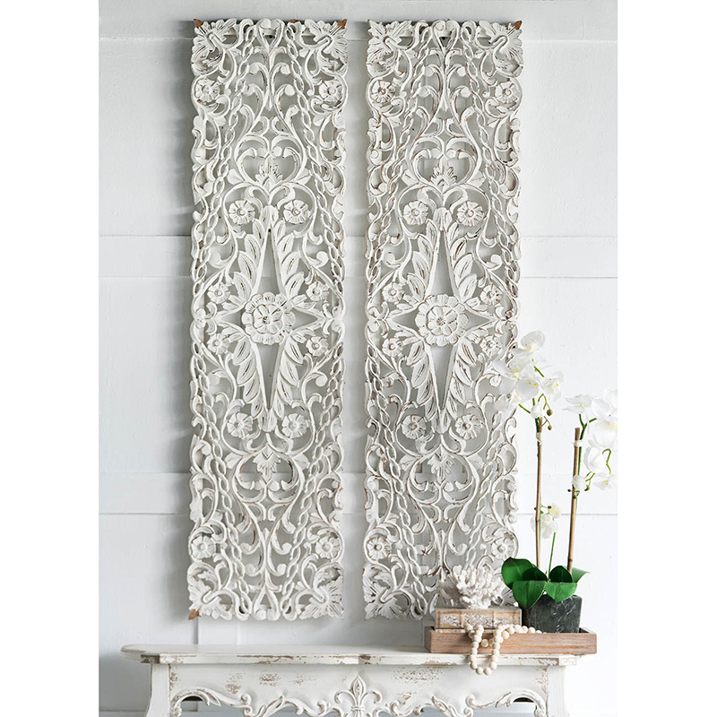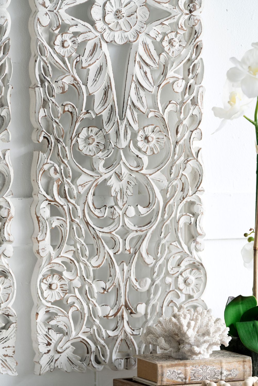 Perfect for large wall, above a mantle, or at the end of a hallway, this graceful piece features a rustic white finish that complements any color scheme.