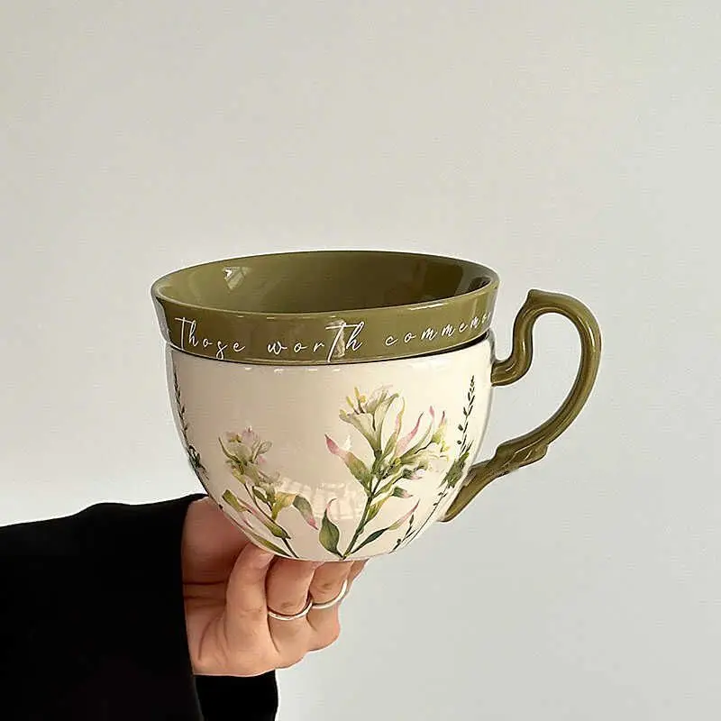 Buy Large Capacity Ceramic Breakfast Cup with Crank Retro Rural Style Coffee Cup Dish Cups Lid Set Household Milk Mug Niche Gift